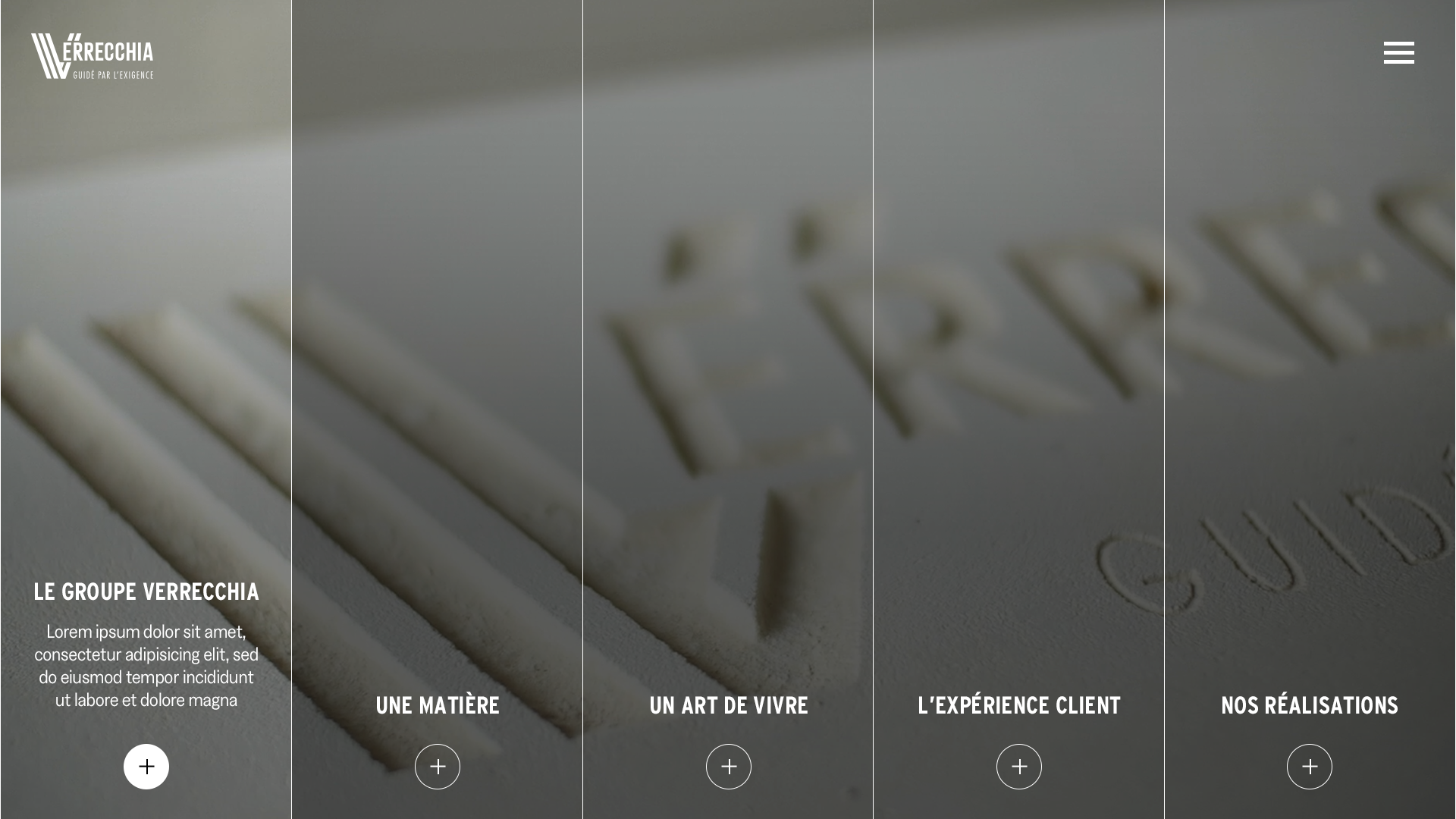 La home page se divise en 5 colonnes qui permettent d’accéder a chacune des thématiques abordées. Au hover, l’image de fond s’adapte a la section concernée. On conservera les lignes sur l’intégralité du site dans un but de cohérence mais aussi pour asseoir la mise en page.